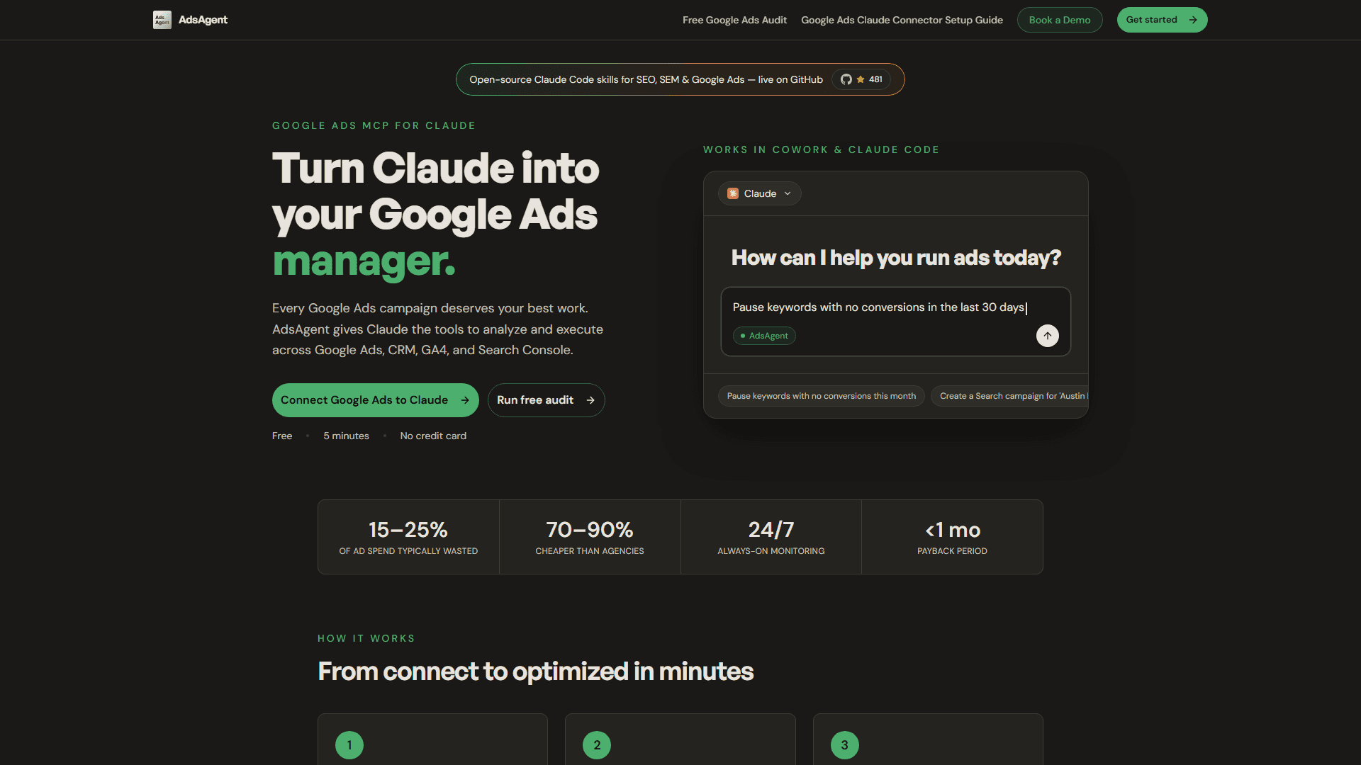 AdsAgent makes a pretty confident assumption with this headline: that you already know what Claude is and what it can do. For their target audience, this qualifies them immediately and grabs their attention. There's no "AI-powered" hedge, instead simply “here's what it becomes when you point it at your ad account.” | ||