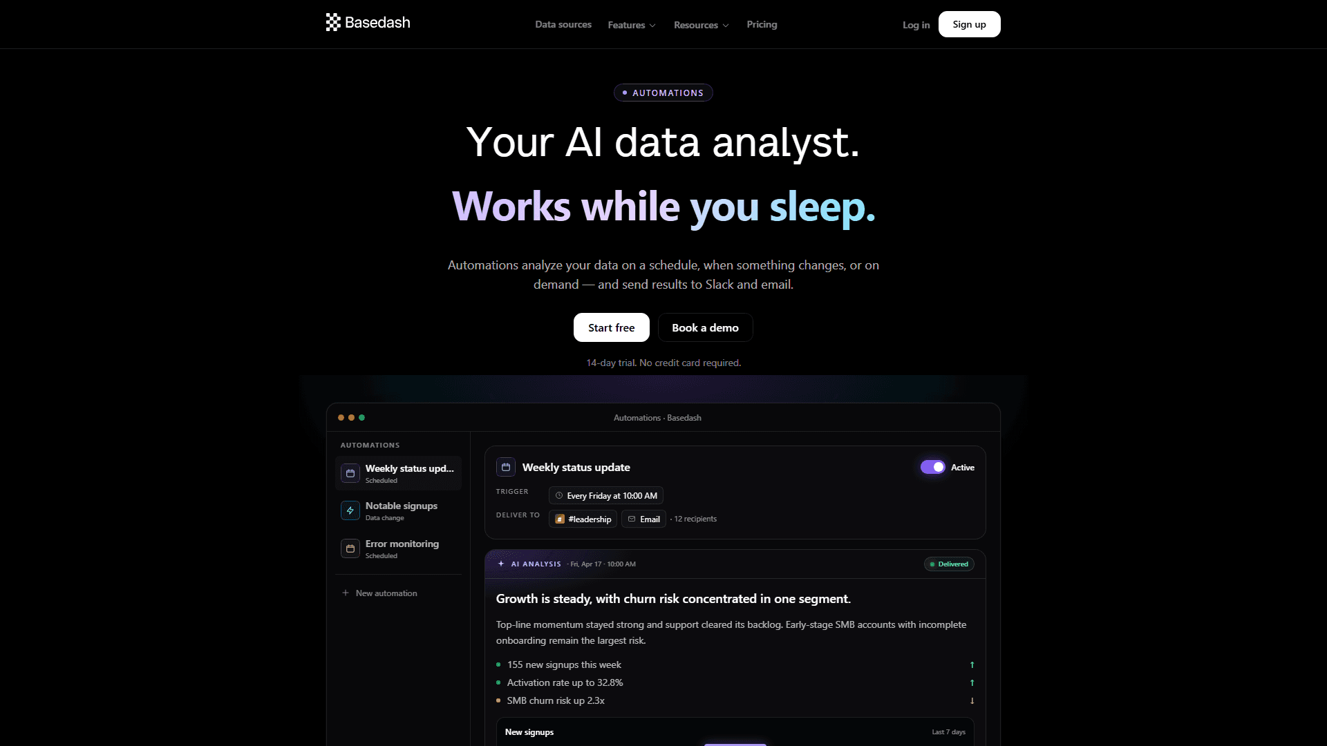 There's a lot of "AI analyst" type products out there right now. What caught us here is the second line. "Works while you sleep" is such a simple thing to say, but it implies something most BI tools won't admit — that the current setup requires someone to be awake and present to get anything done. Basedash removes that assumption. |