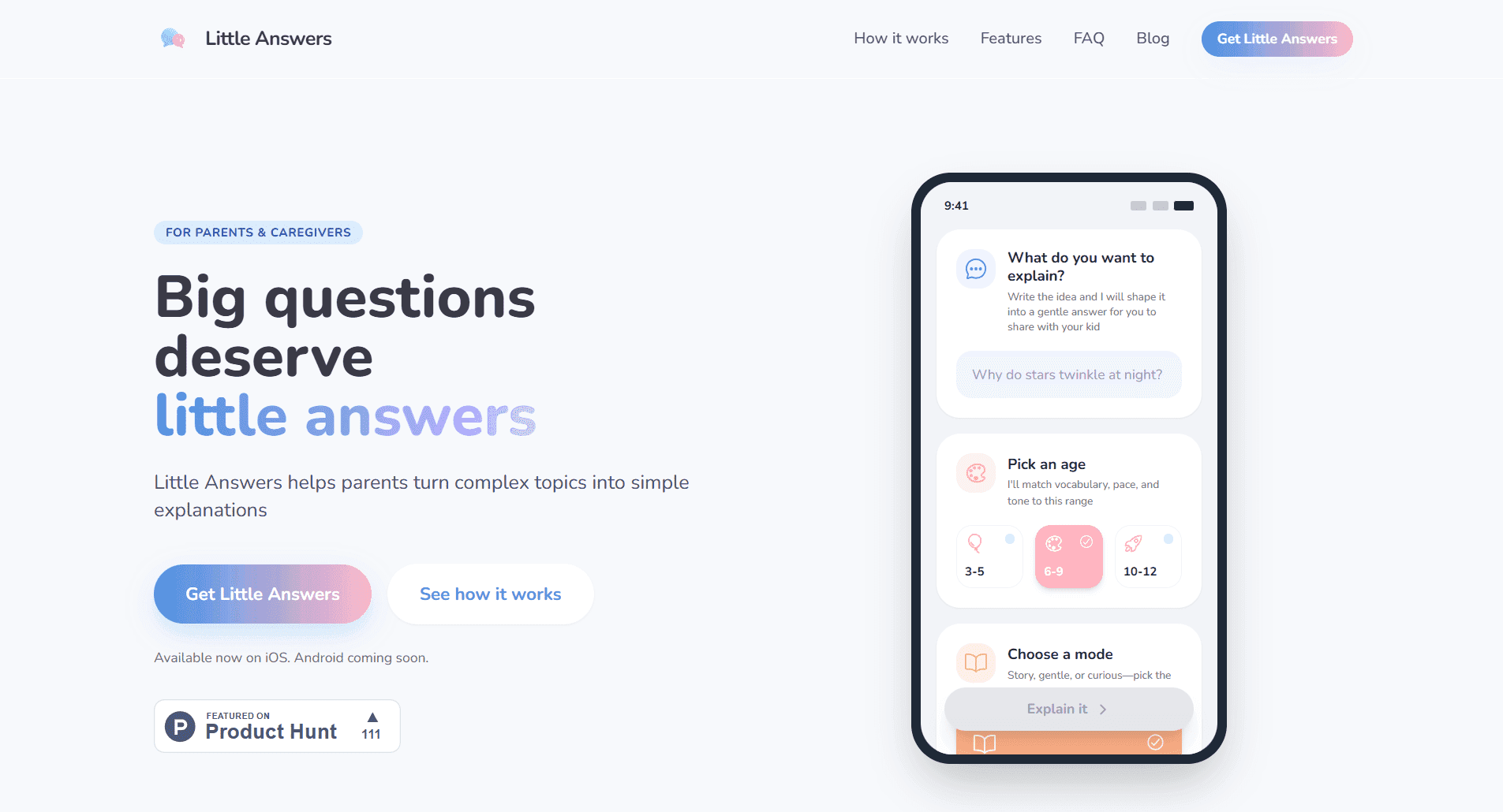 Little Answers leads with a headline that’s empathetic before it’s descriptive. It frames the product around the emotional reality of its audience — parents navigating hard conversations — rather than the mechanics of the tool. |