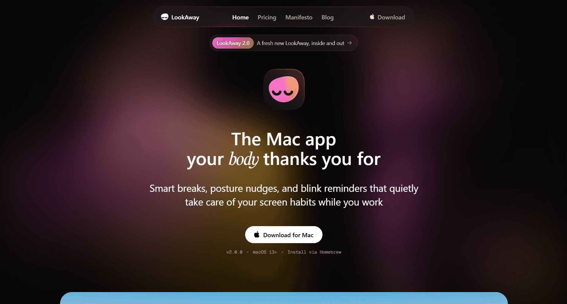 LookAway’s headline lands because it connects software to a physical feeling. Most productivity tools speak to output. This one speaks to the wear and tear of being at a screen all day, which makes the promise feel immediate and personal.